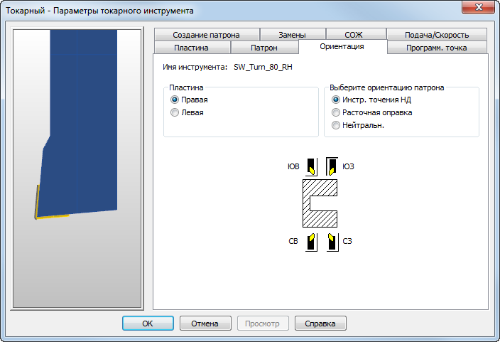 На вкладке Ориентация вы можете задать ориентацию патрона в станке и настройку инструмента под руку.