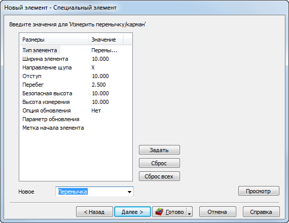 Тип элемента — Выберите тип элемента из Перемычка, Карман или Карман с препятствием. Нажмите Задать, чтобы сохранить параметры.