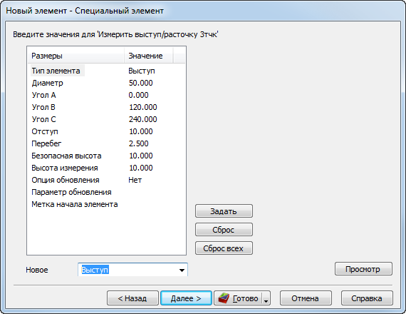 Отступ — Введите или укажите мышью расстояние от начала движения щупа до номинальной точки измерения.