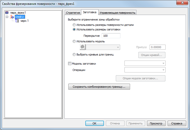 Для других элементов 3D обработки поверхности используйте припуск резания, описываемый на вкладке Заготовка. Опция Перекрытие границы % применяется только в случае, если выбрана опция Использовать размеры заготовкина вкладке элемента Заготовка.