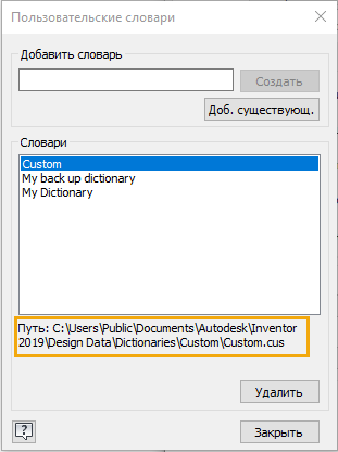 - Пустой пользовательский словарь устанавливается вместе с Inventor и является активным по умолчанию. При добавлении или создании дополнительных словарей щелкните стрелку раскрывающегося списка, чтобы выбрать другой активный пользовательский словарь.