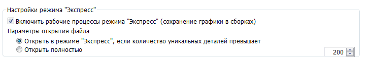 Режим «Экспресс» — это параметр, который необходимо включить. После включения при открытии будет доступно два варианта. Полная загрузка, при которой происходит загрузка все данных компонентов и включение всех команд. Для больших сборок это может повлиять на производительность и время, требуемое для выполнения операций. Или Экспресс-загрузка, при которой происходит загрузка только кэшированной графики, а некоторые команды исключаются.