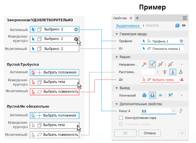 Состояние выбора отображается на панели свойств разными цветами. На следующем изображении показаны состояния и приведены соответствующие примеры.