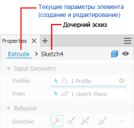 Как правило, панель свойств открывается в режиме определения элементов. Щелкните текстовое поле узла иерархии для переключения из среды «Элемент» в среду «Эскиз» и обратно. Текстовое поле узла иерархии для выбранной среды отображается синим цветом.