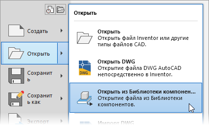 Нажмите меню «Файл» в верхнем левом углу окна Inventor и выберите «Открыть из Библиотеки компонентов».