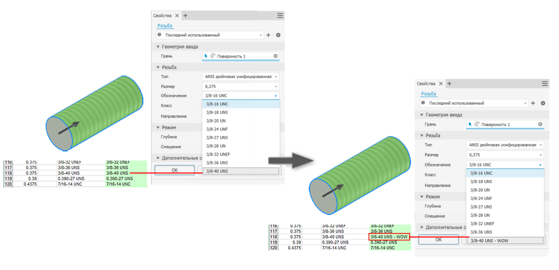 Прим.: Изменения в файле Excel будут введены в действие при запуске. Данные о типах резьбы в связанной таблице не обладают ассоциативностью, то есть изменения в таблице данных не влияют на уже созданную в модели резьбу.