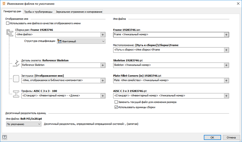Установите флажок «Использовать единицы сборки», чтобы использовать единицы измерения, заданные в сборке. Если флажок снят, используются единицы шаблона.