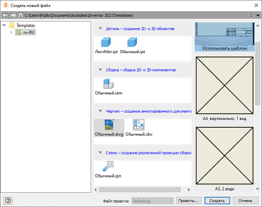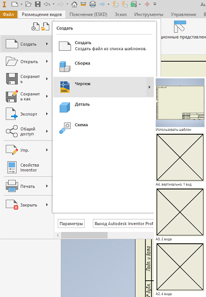 - Во всплывающем меню «Создать» наведите курсор на пункт «Чертеж», чтобы отобразить шаблон и параметры формата листа.