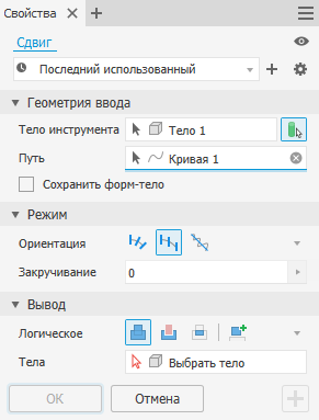 Соединить. Добавление объема, созданного элементом сдвига, к другому элементу или телу. При работе со сборками параметр недоступен.