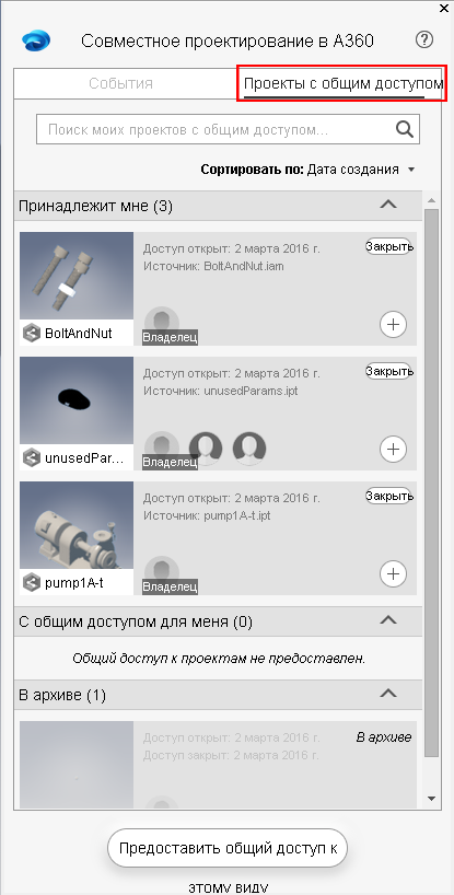 Инструменты для управления общедоступными проектами, которыми ранее можно было воспользоваться только в A360 Drive, теперь есть и в Inventor. Они расположены на панели "Совместное проектирование в A360" новой вкладки "Общедоступные проекты". Владельцы общедоступных проектов теперь могут управлять ими непосредственно из Inventor.