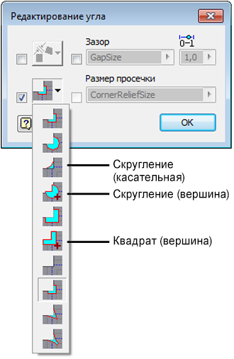 К угловым просечкам добавлены параметры "Скругление (касательная)", "Скругление (вершина)" и "Квадрат (вершина)", обеспечивающие дополнительные возможности для вставки.