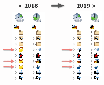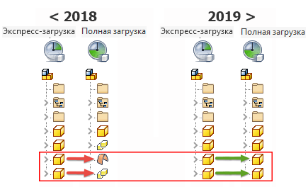 В версии 2018 и более ранних версиях твердые тела, поверхности и мультидетали в режиме «Экспресс» отображались со стандартным значком детали. При переходе в режим «Полный» значки менялись на значки твердого тела, поверхности или мультидетали.