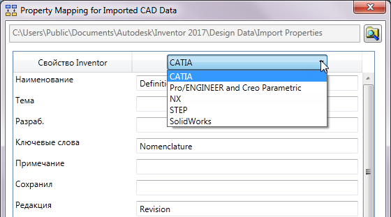 Дополнительную информацию см. в разделе Сопоставление свойств импортированных данных САПР со стандартными свойствами Inventor.