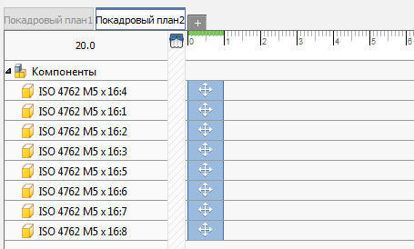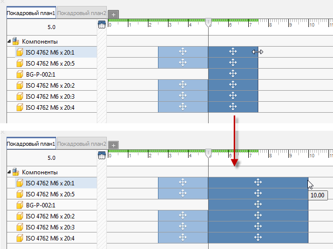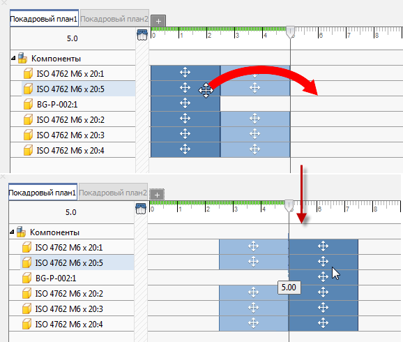 Перенос. Щелкните мышью, нажав и удерживая клавишу CTRL, чтобы выбрать несколько действий, а затем перетащите выбранные действия в другое положение на временной шкале. Перенос в новое положение можно выполнить как до, так и после выполнения других сдвигов. Эта операция доступна для любого количества выбранных действий. При перетаскивании действий в другую точку начала или окончания в наборе сохраняются все взаимосвязи.