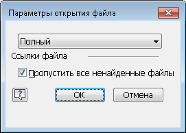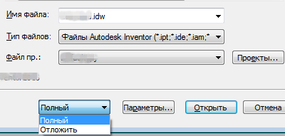 - Поле со списком для открытия в режиме «Полный» или «Отложить» добавлено между кнопками Параметры...и Быстрый запуск. Команда «Отложить» объединяет две прежних команды — «Задерживать обновление» и «Быстрое открытие» — в одно действие, что позволяет открыть чертеж без обновления или загрузки ссылочных документов (деталей, сборок и пр.).