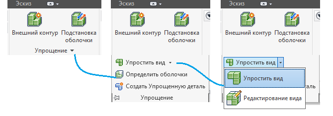 В документах сборки удалена вкладка Упростить, а ее команды перемещены на панель Упрощение. Панель «Упрощение» ранее имела название «Упростить».