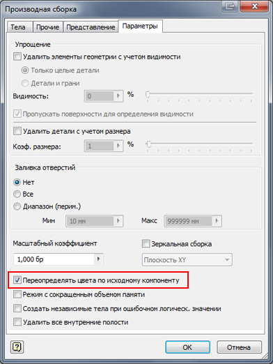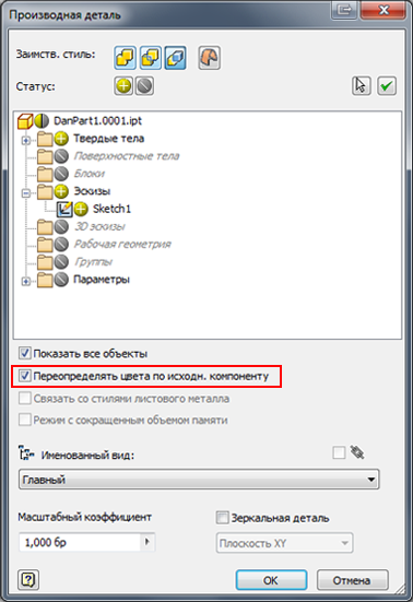 Новое переопределение "Использовать цвет" добавлено из параметра исходного компонента в диалоговое окно "Производная сборка", "Производная деталь", "Создать деталь" и "Создать компонент". Если установлен этот флажок, из производной модели в новую передаются переопределения представления детали, тела, элемента или цвета грани, примененных к граням. Если этот флажок снят, задается представление по умолчанию.