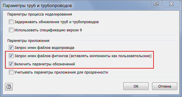 Обновления параметров диалогового окна в среде "Трубы и трубопроводы":