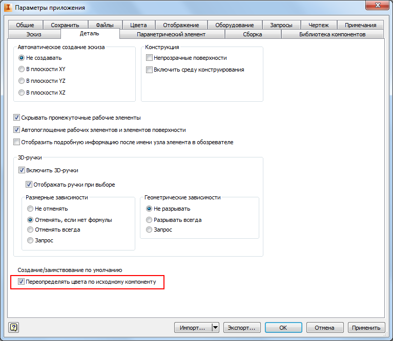 Для глобальной настройки можно по умолчанию задать, чтобы флажок "Использовать переопределение цвета из исходного компонента" был установлен или снят на протяжении сеанса. Этот флажок доступен в диалоговом окне "Параметры приложения" в настройке по умолчанию "Создать/создать производные" на вкладке "Сервис" ленты.