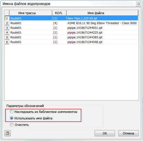 Запрос имени файла фитинга (вставка содержимого как настраиваемого содержимого): при выборе этого параметра доступна настройка имен фитингов в диалоговом окне "Имена файлов трубопровода".