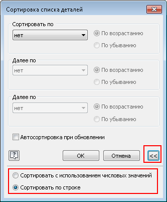 Используйте новые параметры диалоговых окон «Список деталей» и «Спецификация» для управления поведением сортировки. Можно указать способ сортировки в цифровом порядке или по ведущему символу (строке).