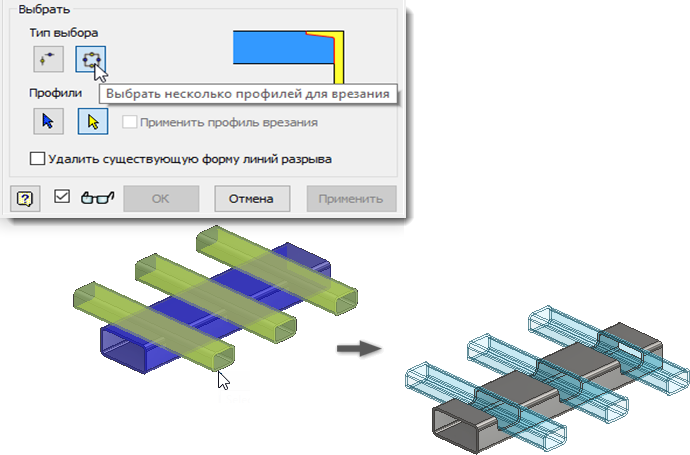 Подробную информацию о параметрах «Стык» и «Врезать» см. в разделе Изменение или применение формы линий разрыва.