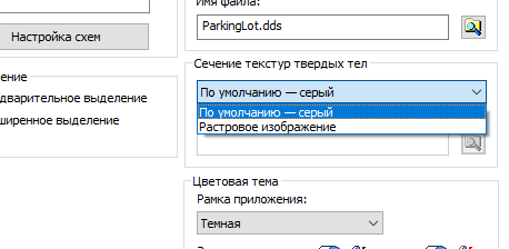 Сечение текстур твердых тел, чтобы задать текстурную карту для использования с торцевыми гранями, которые применяются в сечениях модели. По умолчанию используется серый цвет. Для использования другого цвета создайте изображение и выберите его для использования в качестве сечения текстур твердых тел.