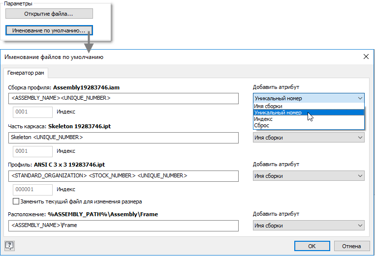 В диалоговом окне «Именование файлов по умолчанию» используйте раскрывающиеся списки «Добавить атрибут», чтобы настроить схему именования.