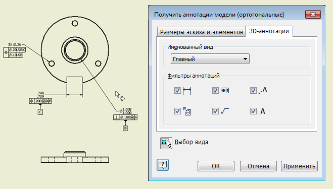 Новая вкладка «3D-аннотации» в диалоговом окне «Извлечь аннотации» позволяет восстановить информацию об MBD в детали и использовать ее на чертеже. Используйте именованный вид и параметры фильтрации для просмотра требуемой информации.