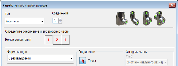 При добавлении соединений в ходе публикации компонентов труб и трубопроводов в диалоговом окне "Разработка труб и трубопроводов" выполняется автоматическое заполнение соединений в соответствии с настройкой формы концов.
