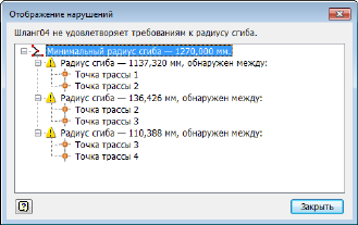 Диалоговое окно "Отображение нарушений" заменило собой сообщение, которое ранее выводилось при проверке проблемного радиуса сгиба. В новом диалоговом окне "Отображение нарушений" отображается дерево, в котором содержатся сегменты сплайна с нарушениями радиуса сгиба. При выборе узла в диалоговом окне соответствующий сегмент выделяется в графическом окне.