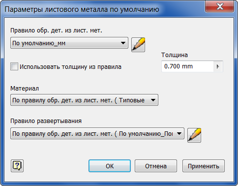 При преобразовании детали в листовой металл теперь отображается запрос для выбора базовой грани. Эта возможность позволяет Inventor измерить толщину материала. После выбора грани появляется диалоговое окно "Параметры листового металла по умолчанию". Измеренная толщина отображается в поле значения толщины. Нажмите кнопку "ОК", чтобы принять измеренное значение толщины.