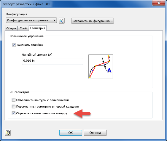 Ранее, если осевая линия сгиба пересекала с его отверстие, использовать экспортированный файл развертки DWG или DXF с некоторыми рабочими инструментами было невозможно. Теперь на вкладку "Геометрия" в диалоговом окне "Параметры экспорта развертки в файл DXF или DWG" добавлен новый параметр. Для обрезки осевых линий сгиба до кромки выреза можно установить новый параметр "Обрезать осевые линии по контуру" на вкладке "Геометрия".