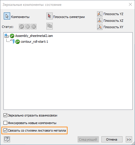 Команда «Зеркальное отражение компонентов» теперь распознает деталь из листового металла и позволяет связать стиль листового металла исходного компонента с зеркально отраженной копией.