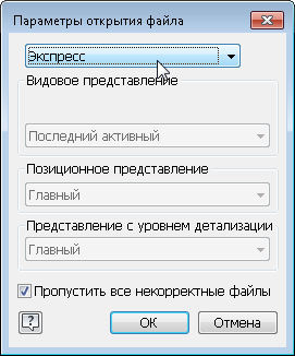 В диалоговом окне Параметры открытия файла... флажок «Открыть в режиме Экспресс» заменен на поле со списком «Полный или «Экспресс».