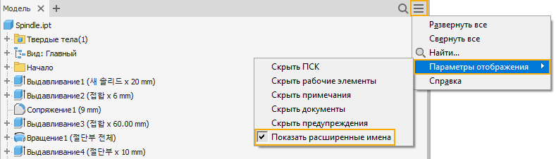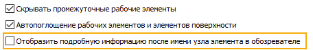 Параметр Отображение дополнительных сведений после имени узла элемента в обозревателе (доступно в разделе «Параметры приложения»/вкладка «Детали») и параметр Показать расширенные имена (доступно в меню обозревателя модели) улучшены и теперь поддерживаются для следующих команд.