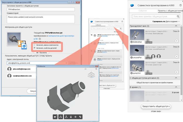 Функции работы над общими проектами, представленные в Inventor 2016 R3, позволили упростить процессы совместной проверки проектов из любого места и с любого устройства. Усовершенствования в Inventor 2017 позволяют дополнительно ускорить и упростить совместную работу. Теперь просматривать данные об участниках проекта и их отзывах, а также управлять этими данными можно непосредственно из Inventor. Новые элементы управления позволяют участникам группы совместно использовать свойства и имена деталей, а также графические изображения моделей, чтобы дать точную оценку проекту.