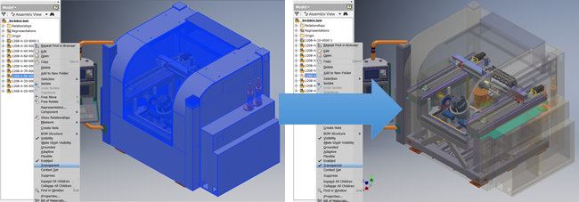 Новые ярлыки позволяют ускорить выполнение стандартных задач и настроить Inventor в соответствии с требованиями конкретного рабочего процесса. Можно также настроить ярлыки для функций видимости, прозрачности, команд маршрутизируемых систем и многих других. Переключатель прозрачности позволяет быстро просмотреть содержимое сборок.