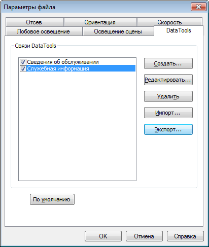 В диалоговом окне Параметры файла на вкладке "DataTools" в области "Связи DataTools" выберите связь, экспорт которой требуется выполнить, и нажмите кнопку "Экспорт".