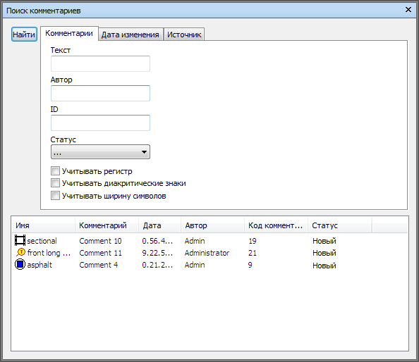 Окно "Поиск комментариев" - это закрепляемое окно, в котором выполняется поиск комментариев и тегов на основе данных комментария (текста, автора, кода, статуса), даты изменения комментария и источника комментария.