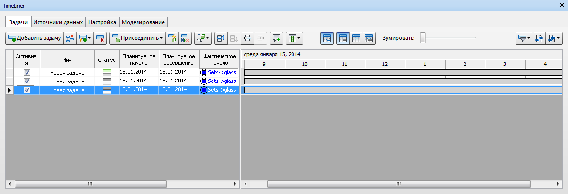 Задачи можно присоединять к текущим выбранным объектам в виде сцены либо к любому из наборов объектов или наборов поисковых запросов. Также можно перетаскивать элементы из панели "Сцена", окна "Наборы" и дерева выбора непосредственно в задание. Тип присоединения можно просматривать в столбце "Присоединено". По умолчанию, этот столбец располагается после столбца "Тип задачи", но можно переместить его, например, установив перед столбцом "Начало".