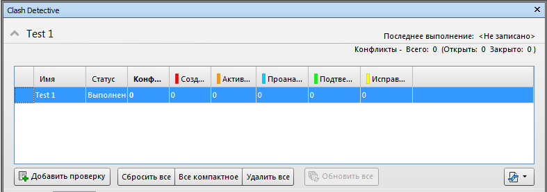 Сводка проверок на наличие конфликтов, выбранная в данный момент, отображается в верхней части других вкладок диспетчера конфликтов. Общее количество конфликтов в проверке отображается вместе со сведениями об открытых ("Новое", "Активно", "Проанализировано") и закрытых конфликтах ("Утверждено", "Исправлено"). Если проверка на наличие конфликтов была изменена с момента ее настройки (в т. ч. изменение или загрузка обновленной редакции модели), это означает, что результаты могут не соответствовать последней модели или параметрам, и в этом случае отображается предупреждение