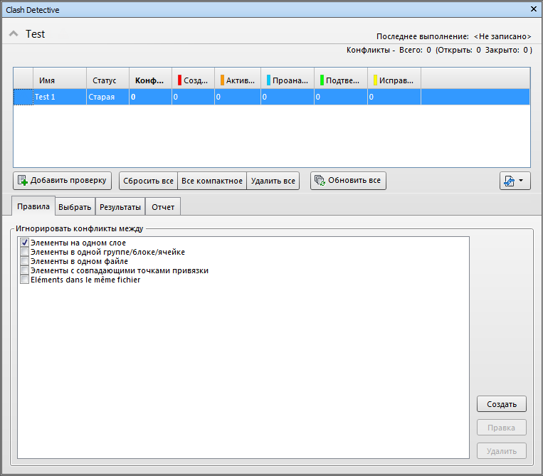 В закрепляемом окне Диспетчер конфликтов задаются правила и параметры выполнения проверок на наличие конфликтов; в нем также можно просматривать и сортировать результаты проверок и формировать отчеты о конфликтах.