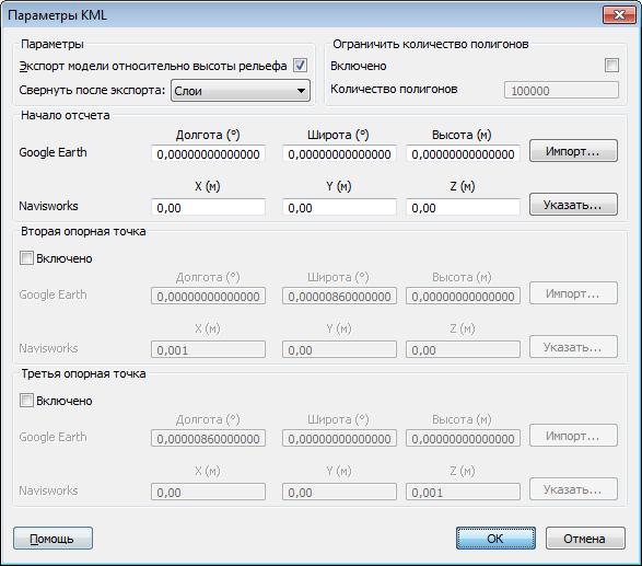 Перед выполнением экспорта следует убедиться, что эти точки видны в панели "Сцена", поскольку при открытии диалогового окна "Параметры KML" навигацию к ним будет выполнить невозможно.