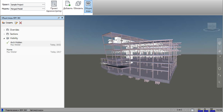 Щелкните "Общие виды" для переключения между BIM 360 Glue и Navisworks. Общие виды синхронизированы в режиме реального времени.