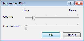 Для формата JPEG нажмите кнопку "Параметры" и в диалоговом окне "Параметры JPEG" задайте требуемые значения для параметров "Сжатие" и "Сглаживание".