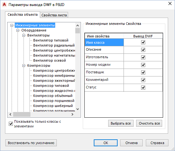 - В диалоговом окне "Параметры вывода" на вкладке "Свойства объекта" установите флажок "Показывать только классы с элементами".