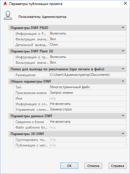 Информация о трубопроводе. Указывает, включаются ли данные, связанные с трубопроводом, в публикуемый выходной файл DWF. Следует указать "Включать" или "Не включать". Можно также щелкнуть это поле и нажать кнопку [...], чтобы открыть диалоговое окно "Параметры DWF Plant 3D".