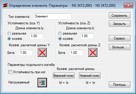 Имя выбранного типа элемента указывается в поле Тип элемента (в это поле можно ввести любое имя типа элемента). Поля Продольный изгиб (ось Y) или Продольный изгиб (ось Z) используются для задания длины элемента в соответствующей плоскости. Определить длину можно двумя способами: