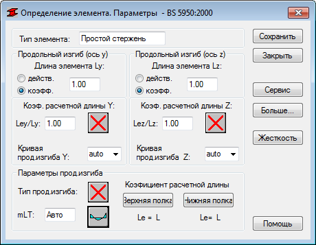 Поле Коэффициент расчетной длины используется для определения Коэффициентов расчетной длины элемента в обоих направлениях. Действительная длина стержня (или сумма длин составляющих элементов) вводится автоматически в соответствующие поля.
